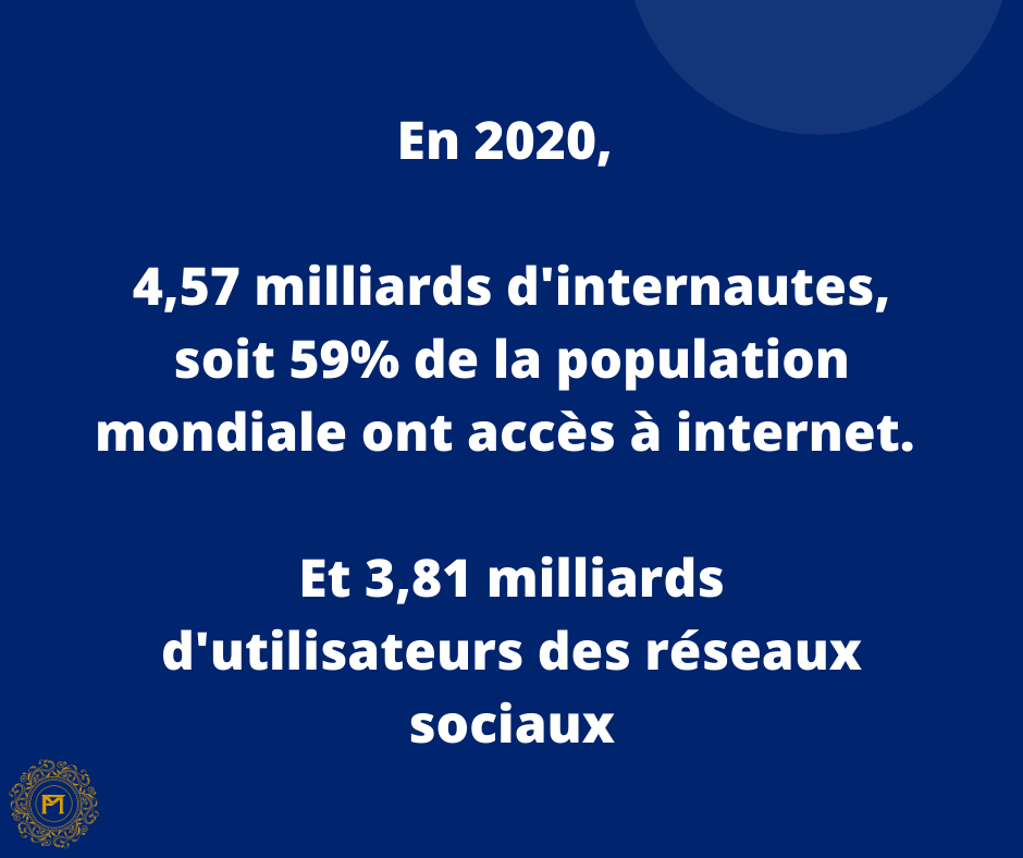 En 2020, ce sont pas moins de 4,57 milliards d’internautes, soit 59% de la population mondiale, qui ont accès à internet. Et 3,81 milliards d’utilisateurs des réseaux sociaux, 49% des internautes, sans oublier que 3,76 milliards d’utilisateurs des réseaux sociaux sont sur mobile. Ce qui fait tout naturellement le plus grand terrain disponible de diffusion et d’opportunités pour votre entreprise et votre activité